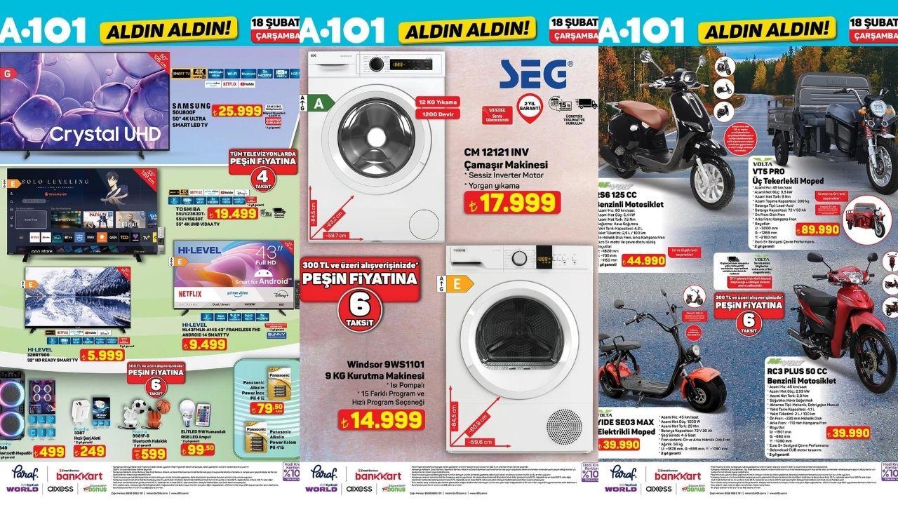 A-101, 18 Şubat itibarıyla geçerli olacak yeni kataloğunda dev ekran televizyonlardan akıllı beyaz eşyalara, modern ev mobilyalarından çocuk giyimine kadar yüzlerce ürünü cazip fiyatlarla satışa sunuyor.