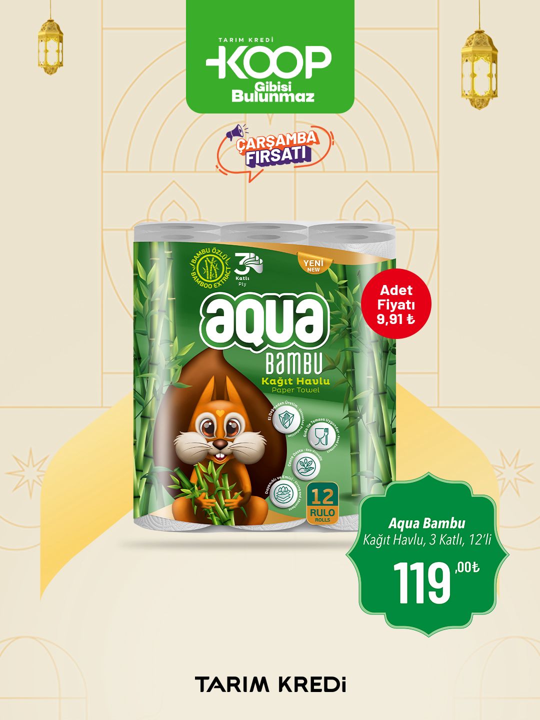 arım Kredi Kooperatif Marketleri, “Çarşamba Fırsatı” kapsamında temel tüketim ürünlerinde dev bir indirime gitti. Kampanya dahilinde Aqua Bambu marka 3 katlı, 12’li kağıt havlu paketi sadece 119 TL’den satışa sunuldu. Adet fiyatının 9,91 TL’ye kadar düştüğü bu fırsat, özellikle toplu alışverişle tasarruf etmek isteyen vatandaşlar için raflardaki yerini aldı.